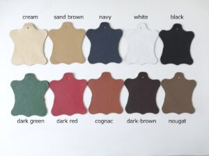 イタリア製のアニリンレザーを使用。革本来の使い心地の良さや経年変化を堪能できる革です。シボ加工で、傷や汚れがつきにくくなっています。レザーの色は11色からお選びいただけます。サンプルもご用意しておりますので、お気軽にお問い合わせください。